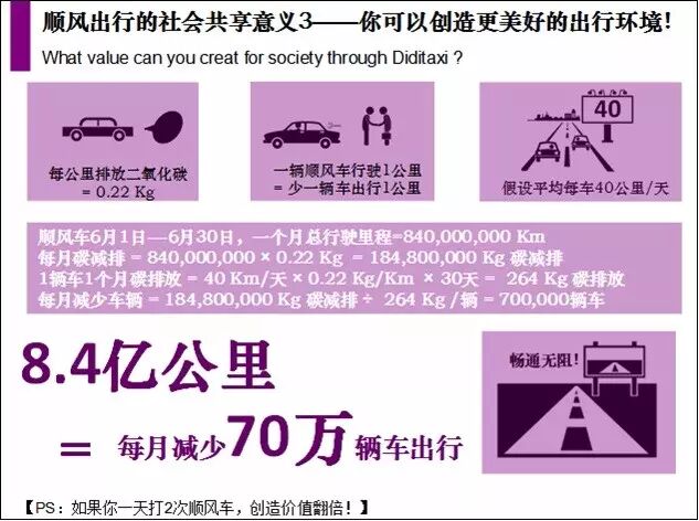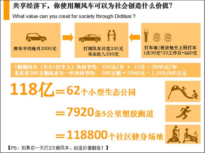 讓我們來簡(jiǎn)單算一筆賬,根據(jù)北京市2014年公布數(shù)據(jù),目前北京市汽車保有量約560萬輛,其中私家車約60%,我們保守一點(diǎn)暫估300萬輛。如果養(yǎng)護(hù)1輛車平均每月花費(fèi)2000元,通過成為順風(fēng)車車友,假設(shè)打車人每天上班打車1次平均支出30元,一個(gè)月22個(gè)工作日,一月車費(fèi)660元,打順風(fēng)車節(jié)約330元,節(jié)約的錢給到車主,每月可分?jǐn)傪B(yǎng)車成本330元,雙方一年12月共節(jié)省3960元,算過沒?全部北京順風(fēng)車車友一年可以華麗麗地省出118億!什么概念,如果用剩下的118億去改善我們的生活環(huán)境,可以創(chuàng)造62個(gè)小型生態(tài)公園、7920條5公里的塑膠跑道、118800個(gè)社區(qū)健身場(chǎng)地!