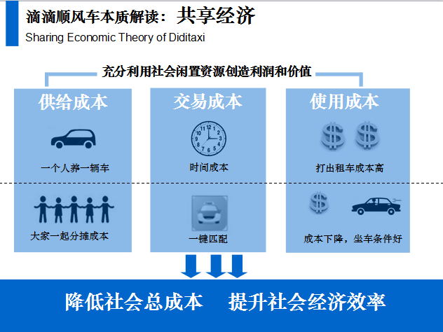 以滴滴順風(fēng)車為例:User(打車人),坐了私家車,付出比打車還便宜的成本;Supplier(車主),本來就要開車養(yǎng)車,現(xiàn)在有人分?jǐn)傆唾M(fèi),降低養(yǎng)車成本;對(duì)雙方而言,只需滴滴打車App一個(gè)點(diǎn)擊一個(gè)支付,全部搞定,高效而簡(jiǎn)單。
