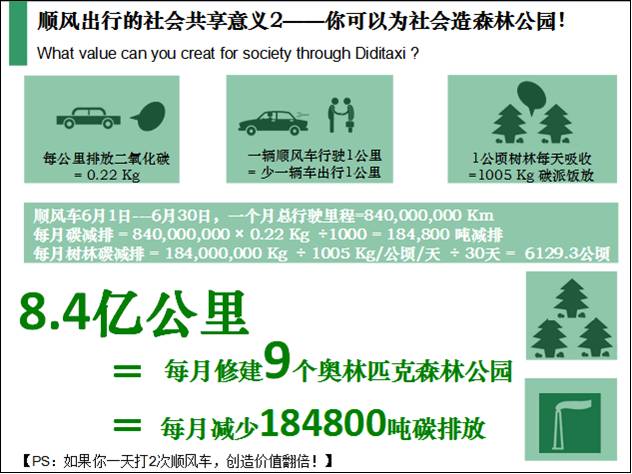 順風(fēng)車使用1個(gè)月,總行駛里程8.4億公里。汽車行駛一公里,約排放0.22千克二氧化碳,相當(dāng)于至少減少184,800,000千克碳排放,即18.48萬噸碳減排。同時(shí),1公頃樹林一個(gè)月吸收二氧化碳約1005Kg,8.4億公里相當(dāng)于每月有6129.3公頃樹木在吸收二氧化碳;北京奧林匹克森林公園樹林面積約680公頃,那么順風(fēng)出行8.4億公里帶來的碳減排,相當(dāng)于每月建造9個(gè)奧林匹克森林公園!